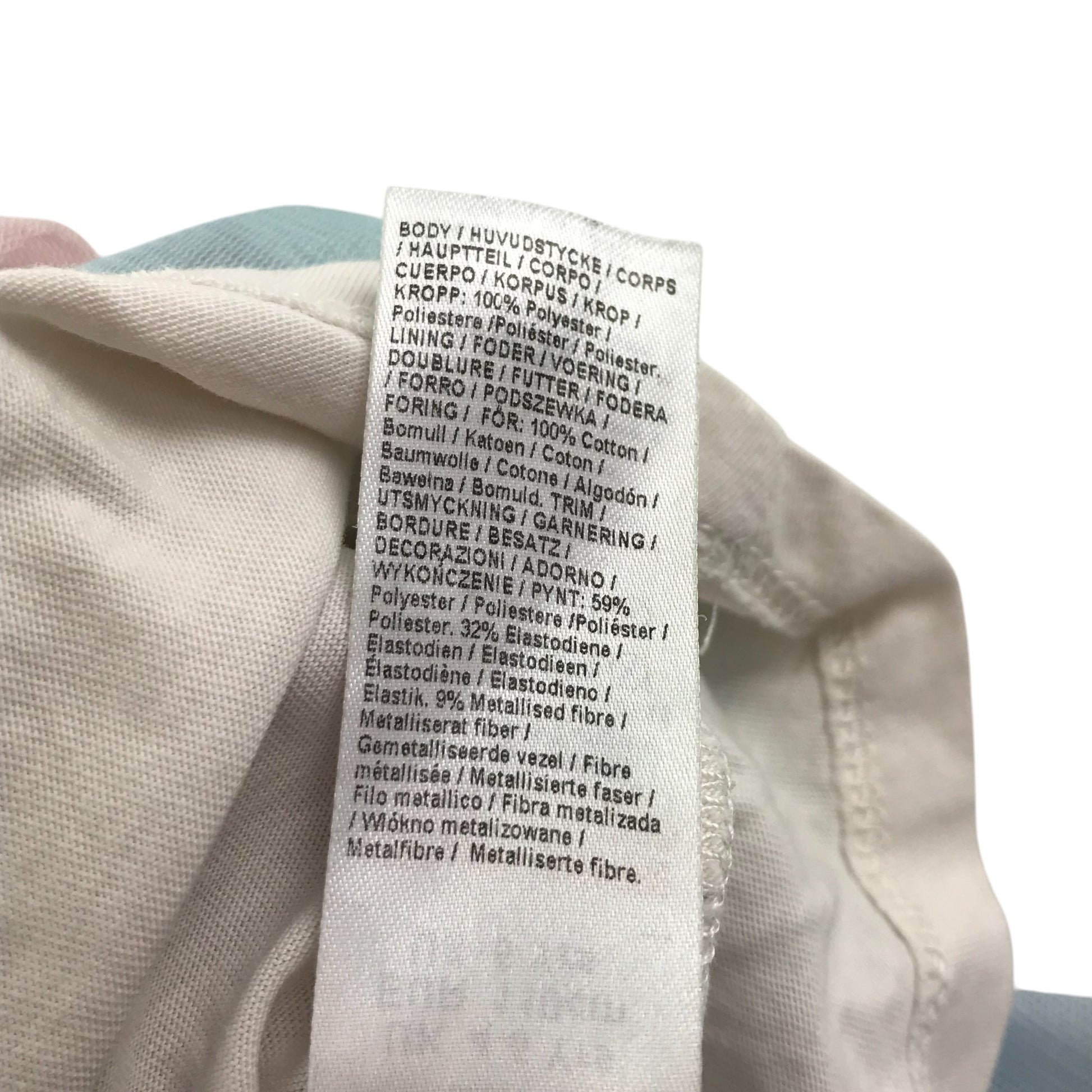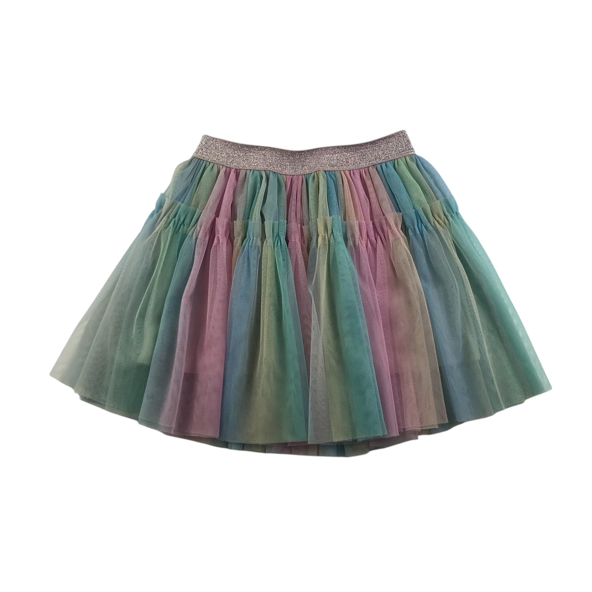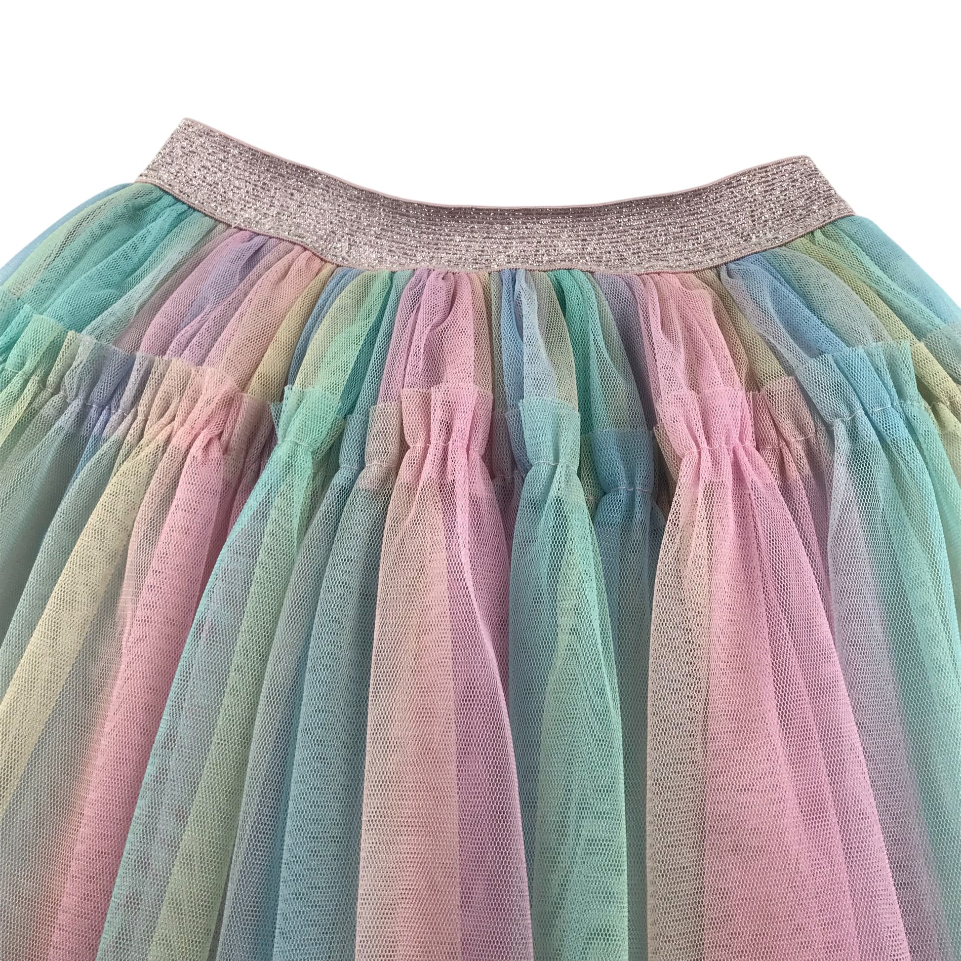 - Clothing features: mesh skirt with multicolour segments, elasticated waistband, under skirt