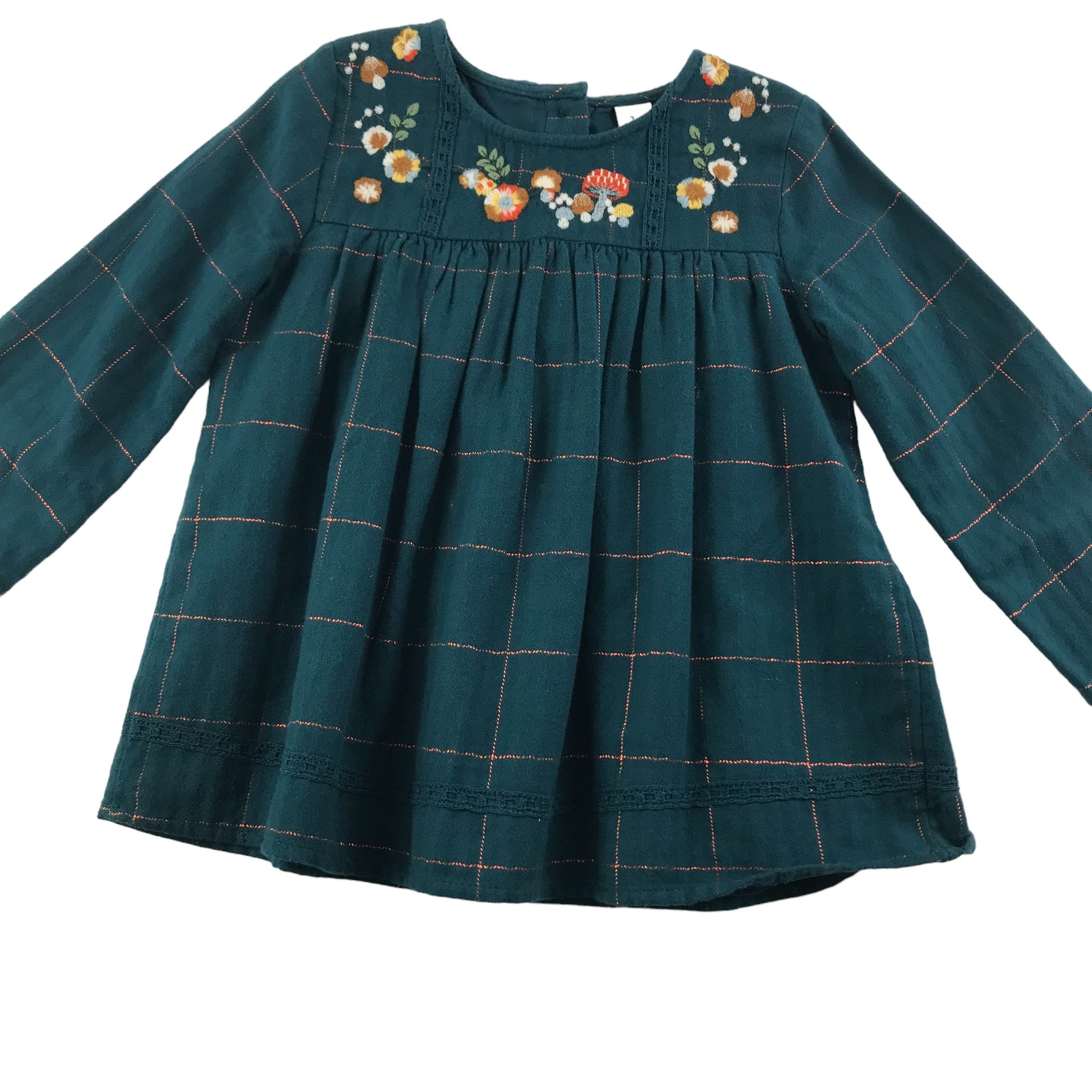- Description: Long sleeve crew neck blouse with check pattern and floral embroidered neckline