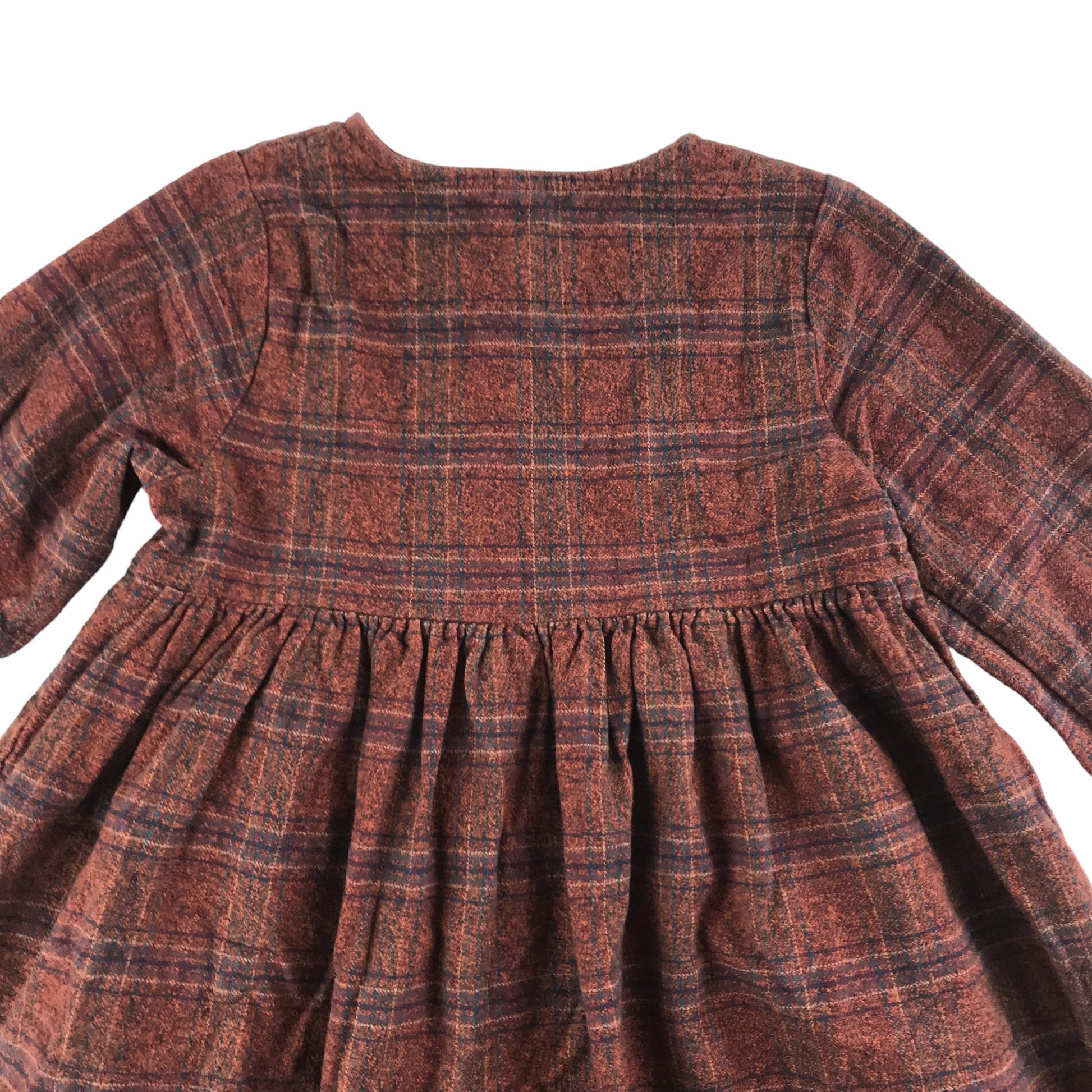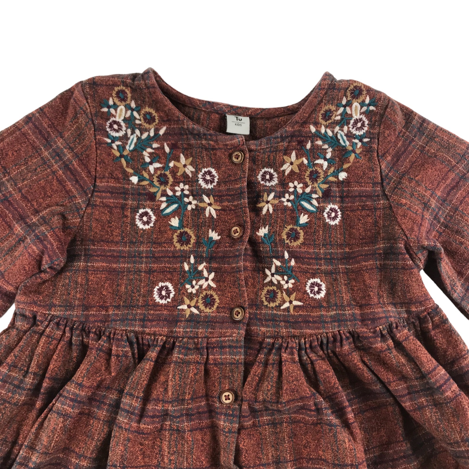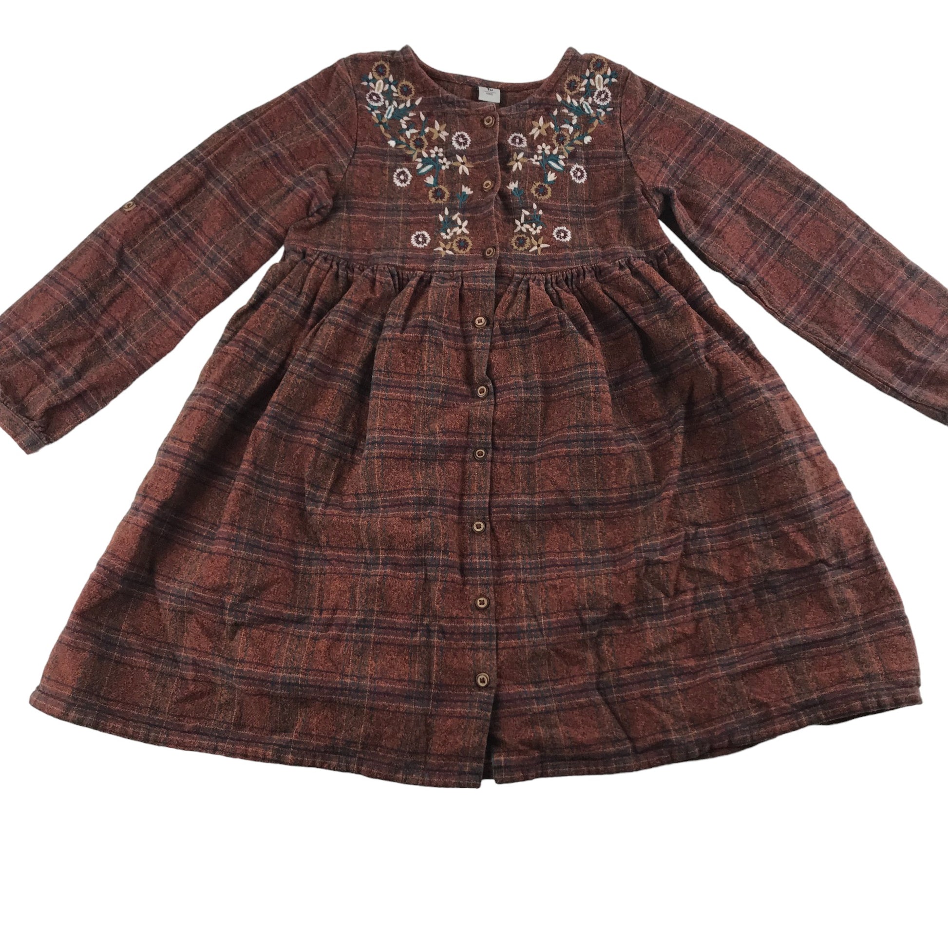 - Description: long sleeve cotton dress with check pattern, flared skirt bit and floral embroideries, buttons in front