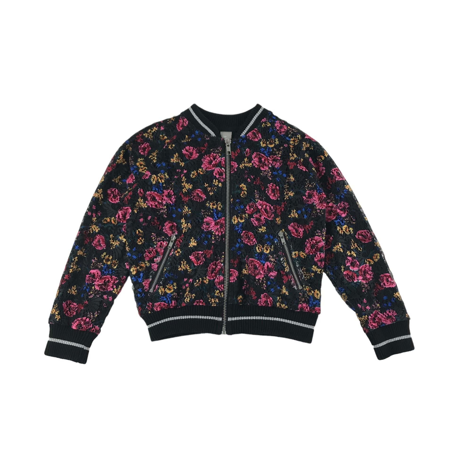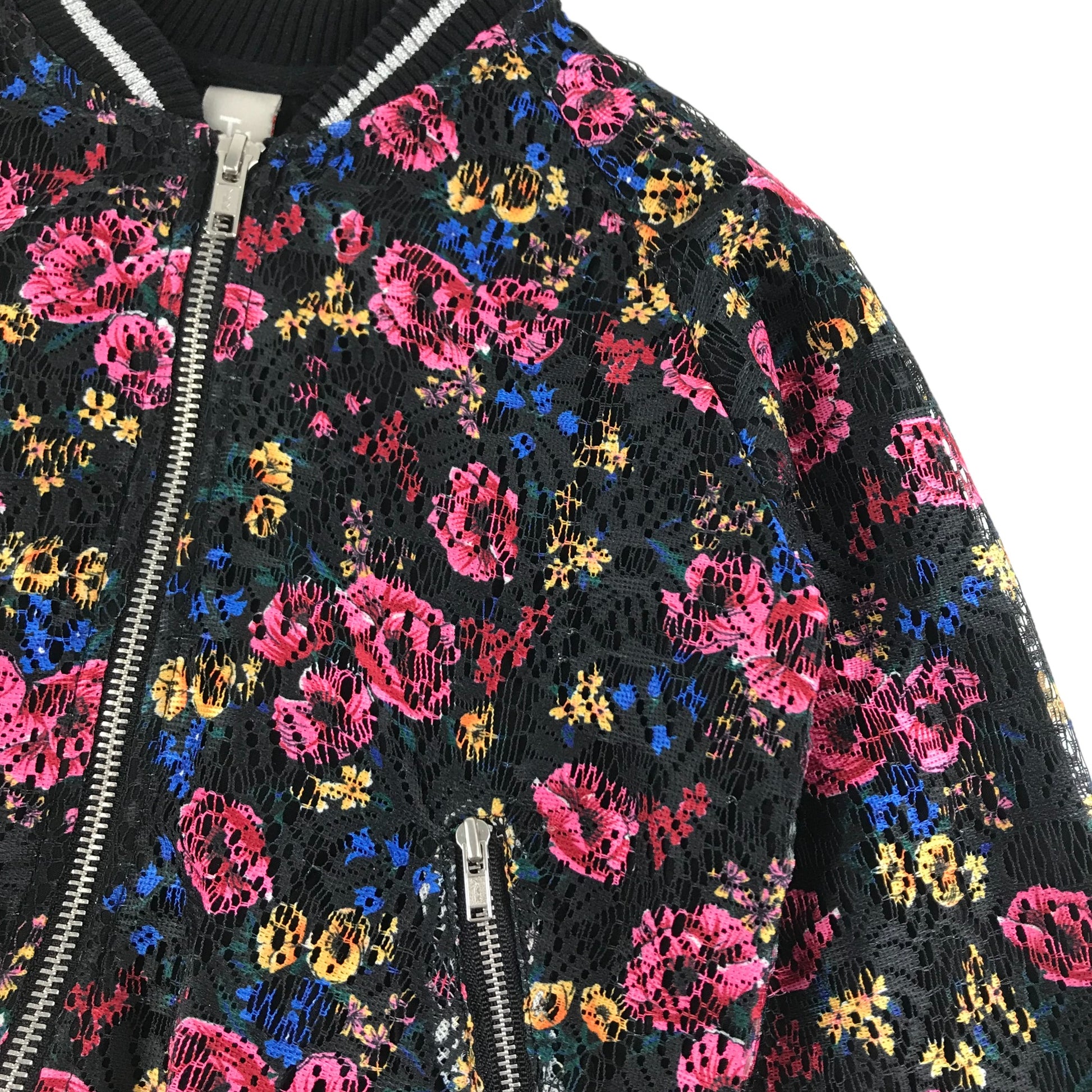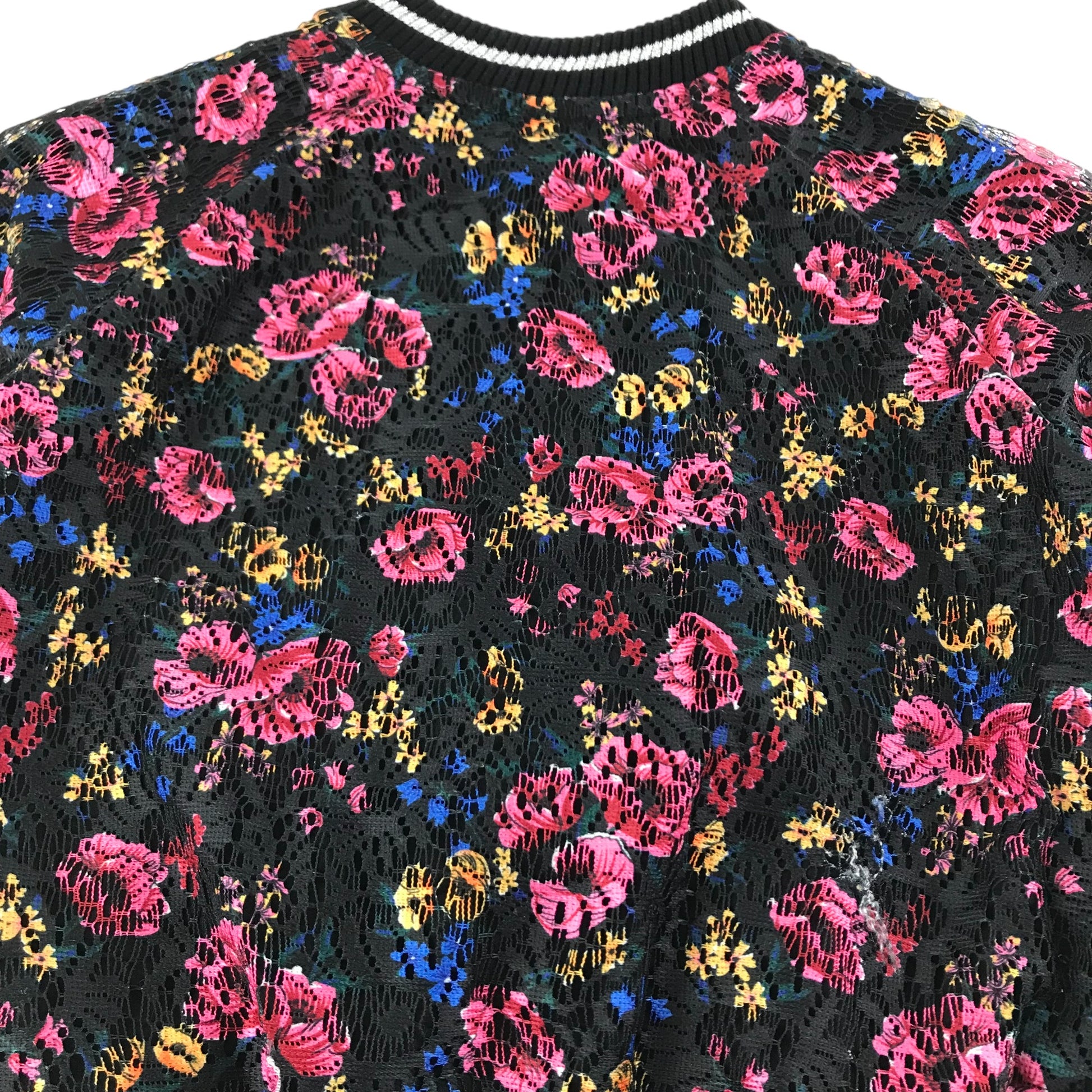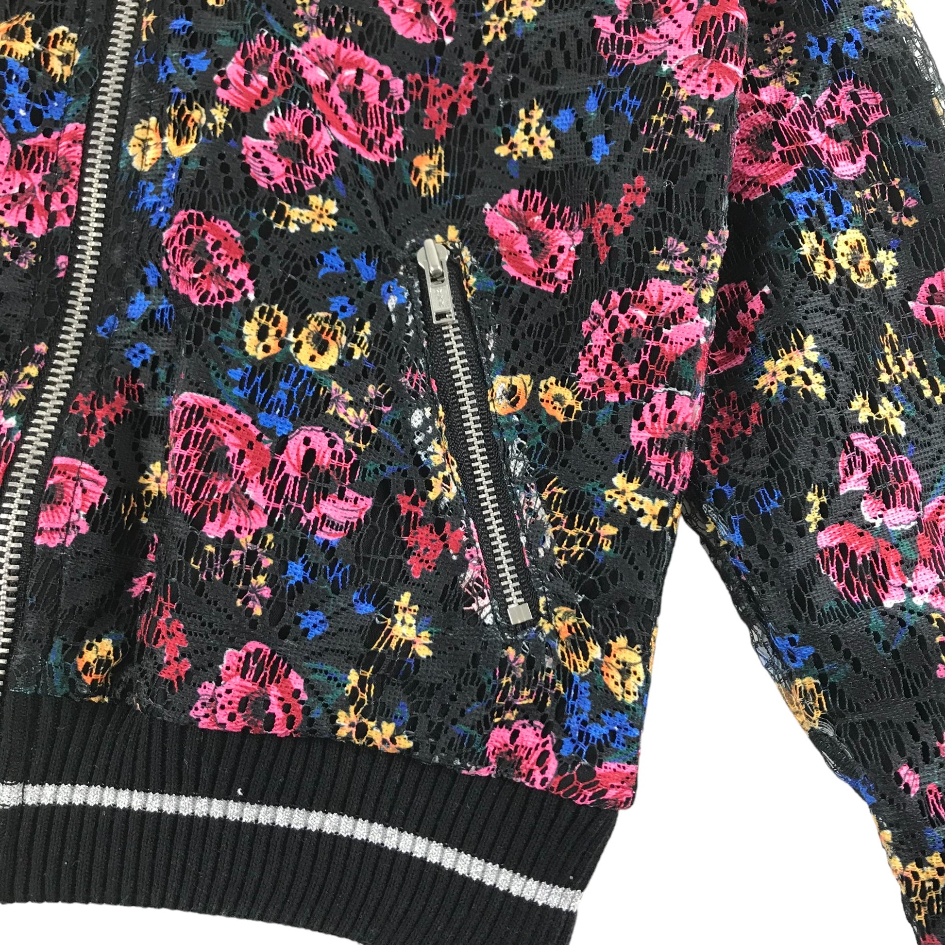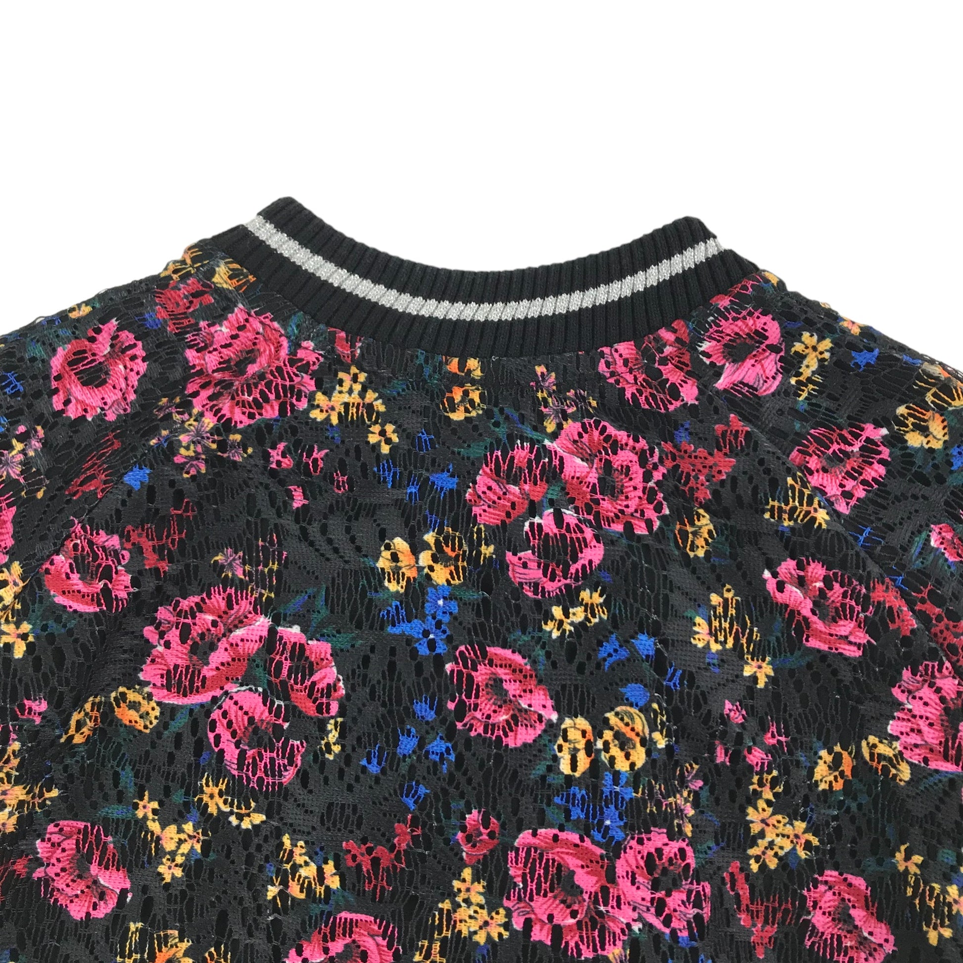 - Description: Long sleeve zipper bomber top with lace-style overlay and floral pattern
