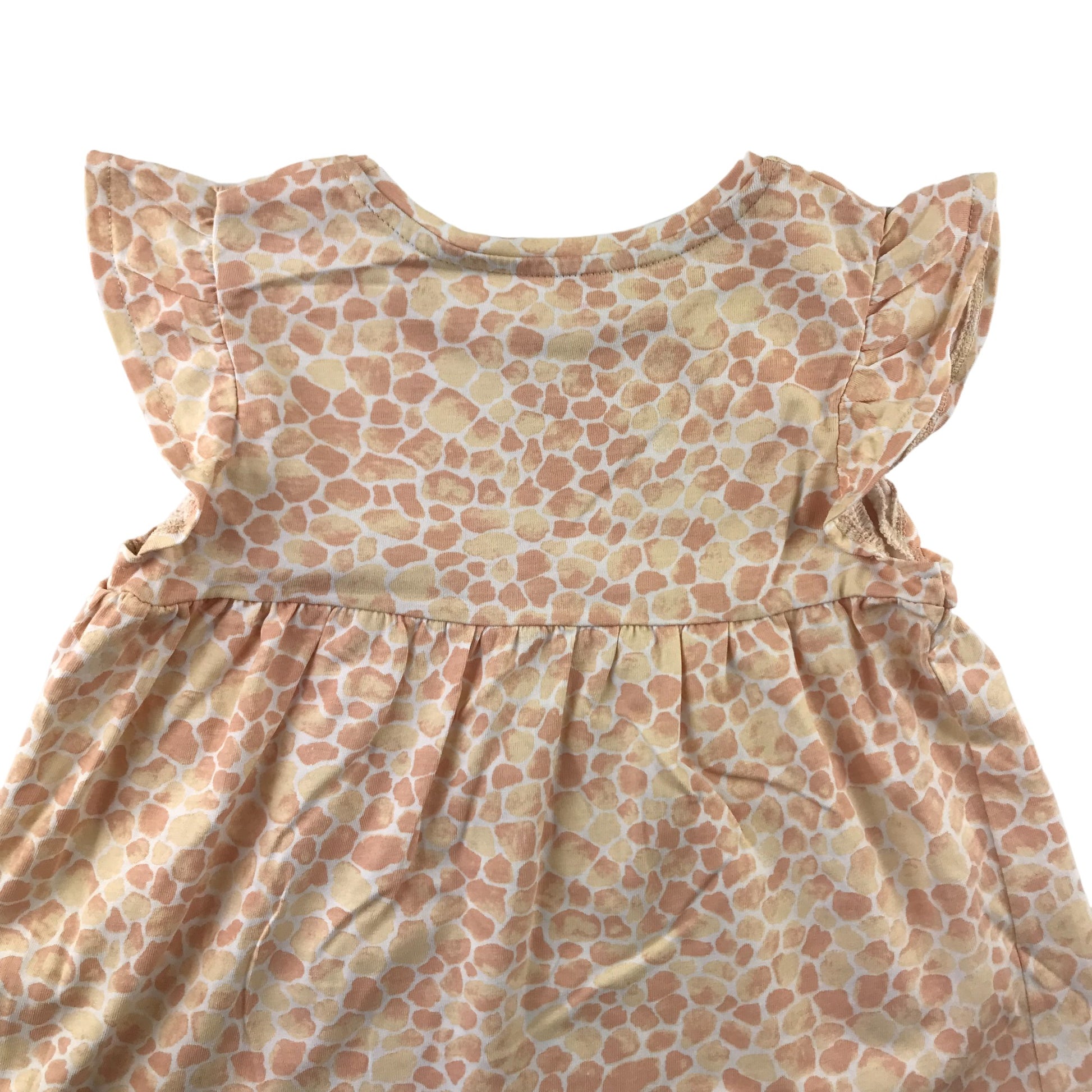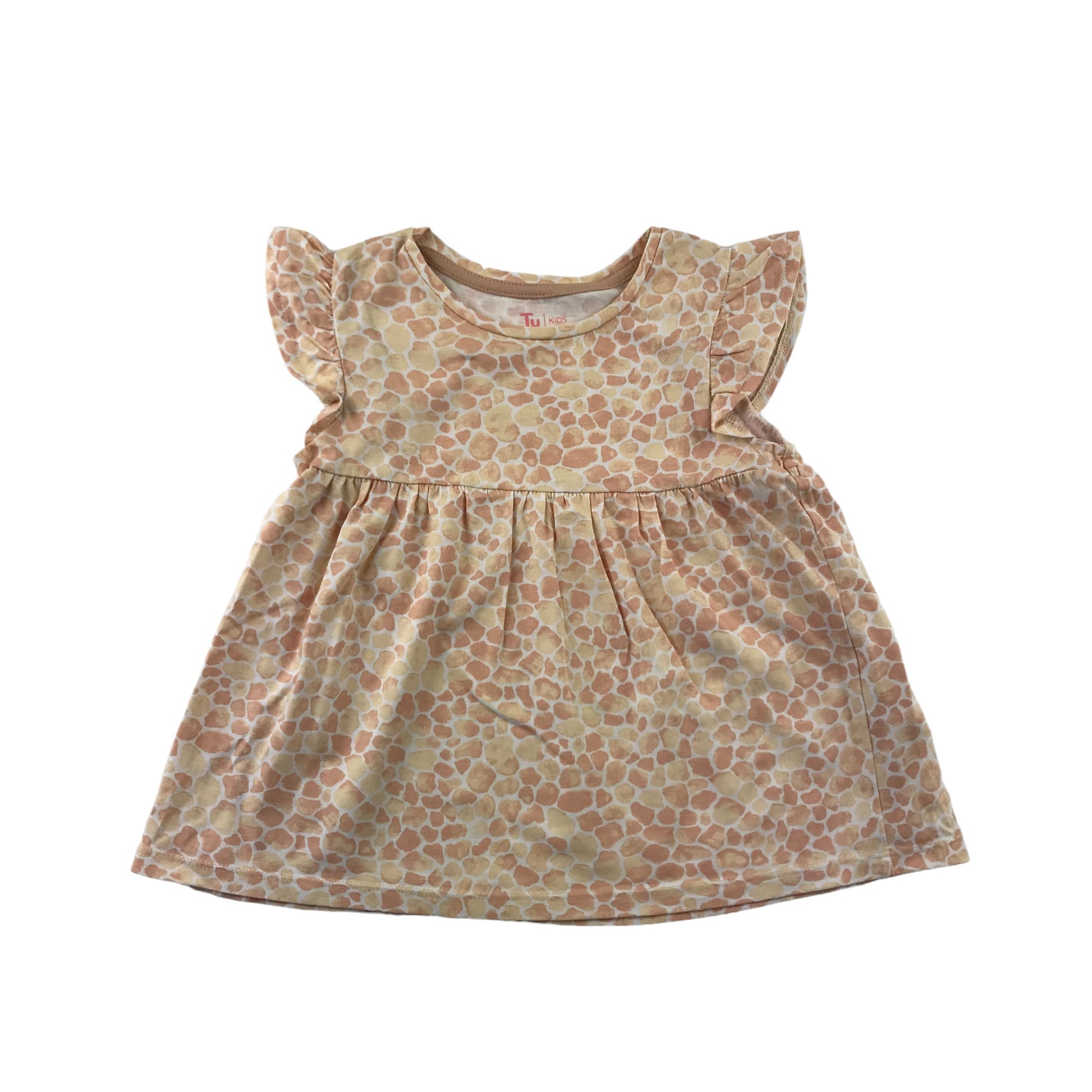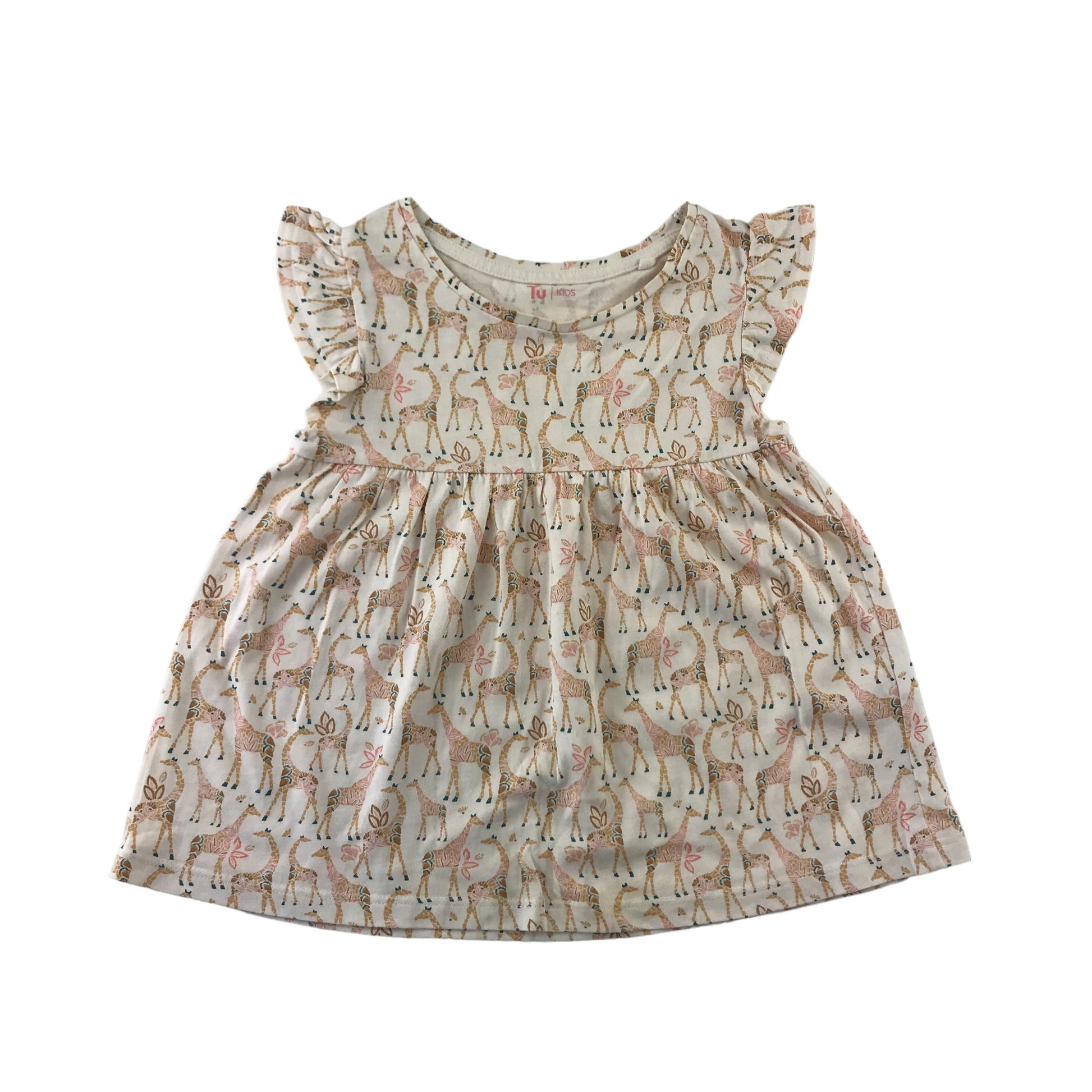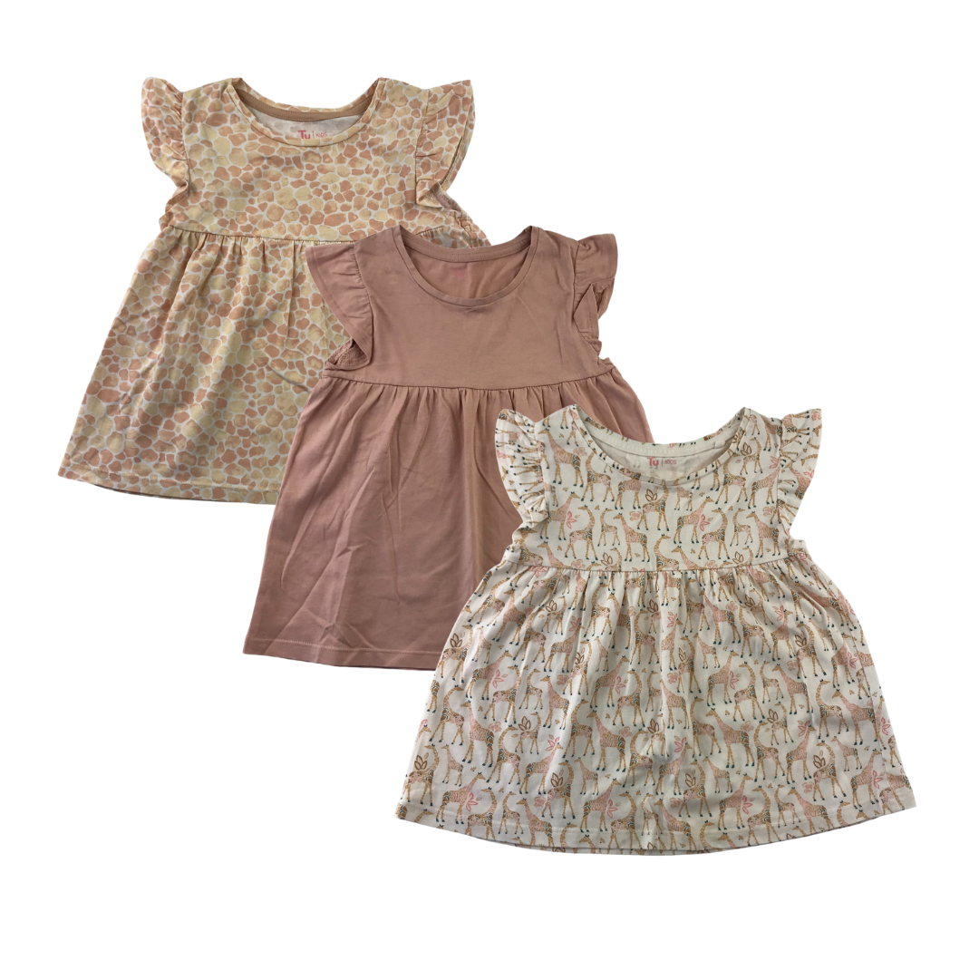 - Description: 3 tops with short butterfly sleeve tops with slightly flared, pleated hems, one graphic spot pattern, one plain and one with giraffe prints