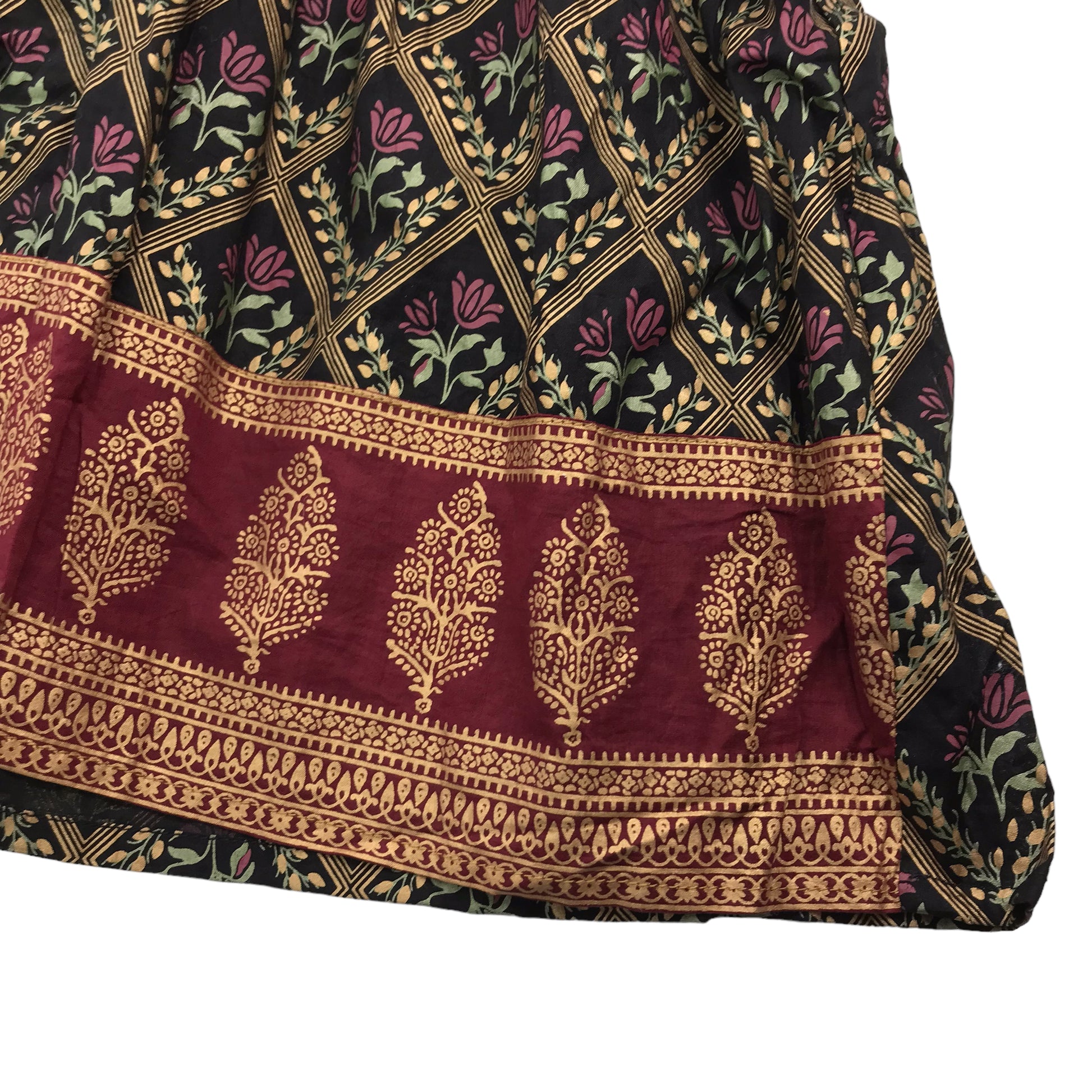 - Description: long sleeve, non stretchy, flared, pattern print, gold, black, purple, maroon